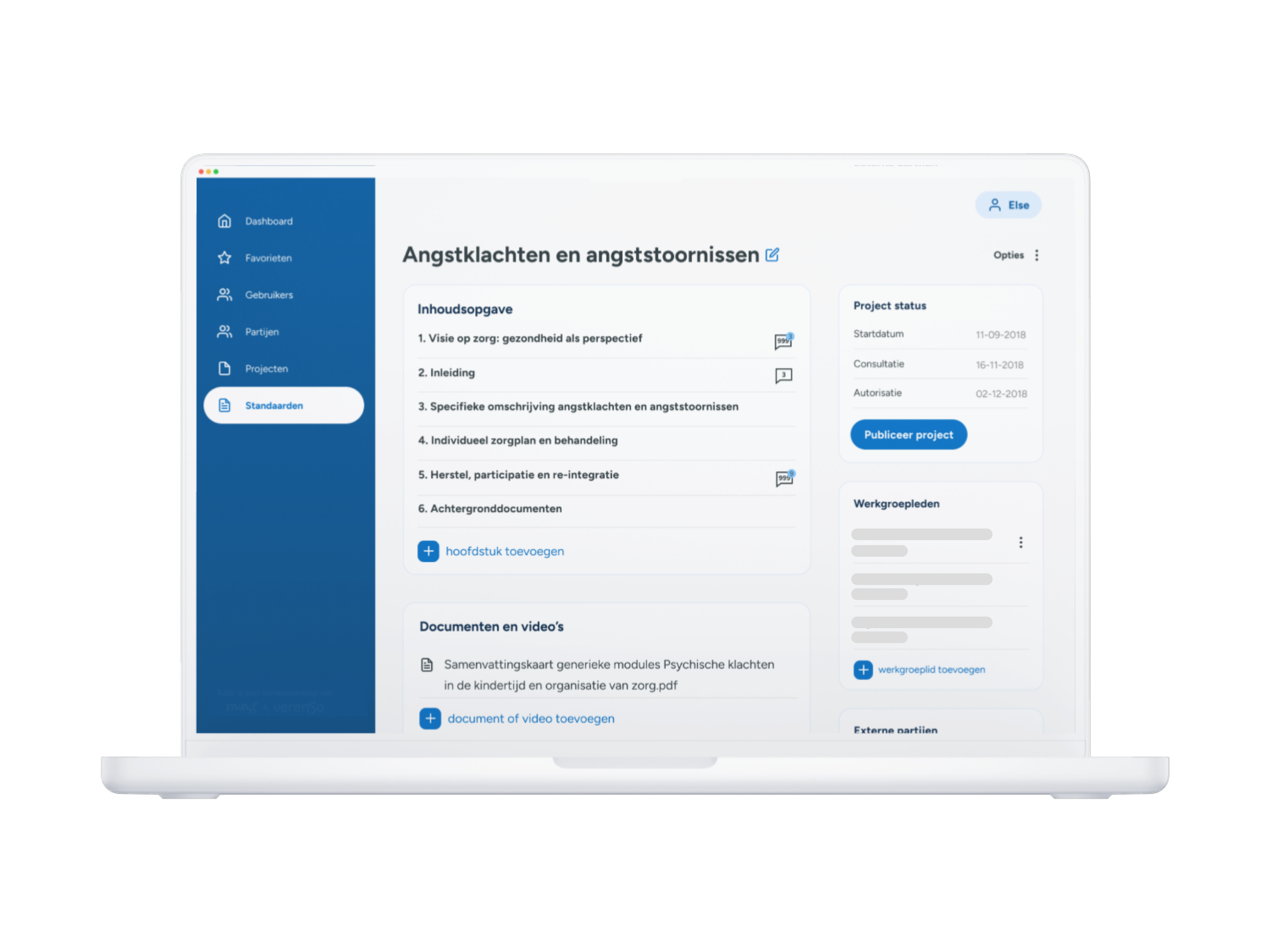 De procesbegeleider of richtlijnadviseur maakt een nieuwe richtlijn aan en nodigt betrokken stakeholders uit als klankbordgroeplid, werkgroeplid, externe partij lid of procesbegeleider. Werk eenvoudig samen met een oneindig aantal interne als externe gebruikers, zonder extra kosten. Je hebt geen hulp van je IT-afdeling nodig; het gebruikersbeheer is eenvoudig en doe je gewoon zelf.