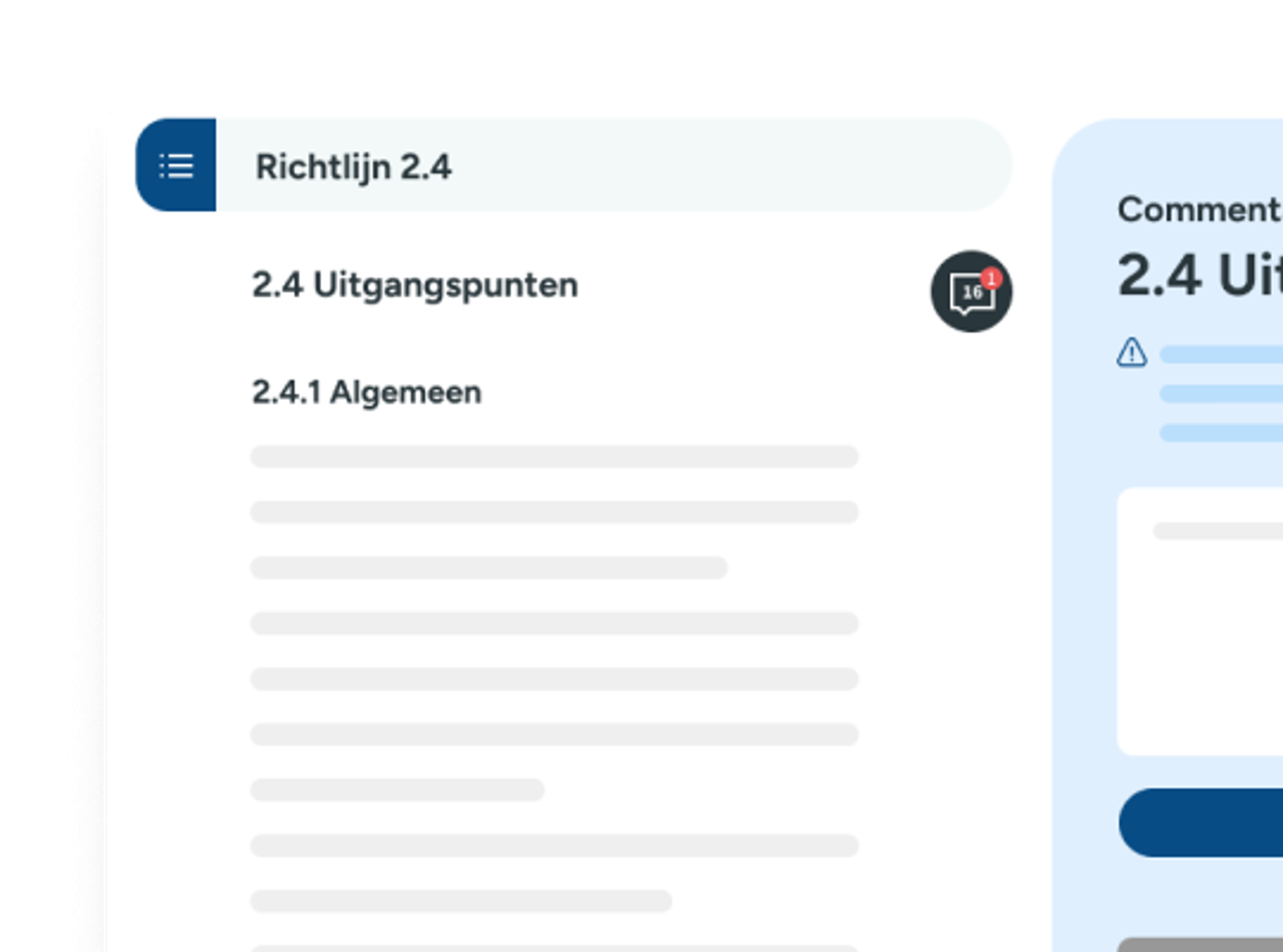 Werken met losse documenten is foutgevoelig, traag en lastig te managen. Met Het Richtlijnenplatform werken alle betrokken stakeholders samen in dezelfde editor aan de meest actuele versie van de richtlijn. Gedurende de hele ontwikkelfase kunnen er suggesties voor verbetering worden geplaatst en verwerkt. Als je ervoor kiest ondersteunen AI-functies dit proces: De mogelijkheid om te starten vanuit een eerste AI opzet op basis van je onderzoeksinput. Controleer teksten automatisch op spelling en taalniveau. Laat AI onderzoeken die je toevoegt gebruiken om de juistheid van teksten te controleren. Stel vragen over inhoud of onderbouwing, op basis van de documenten die in het platform zijn gedeeld.